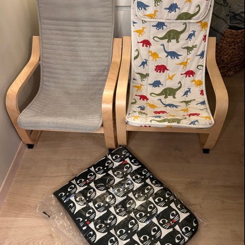 Én poäng barnestol med dinosaurtrekk, samt et ekstra trekk med kattemotiv som er ubrukt.