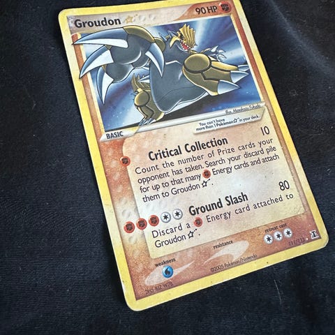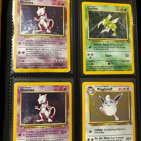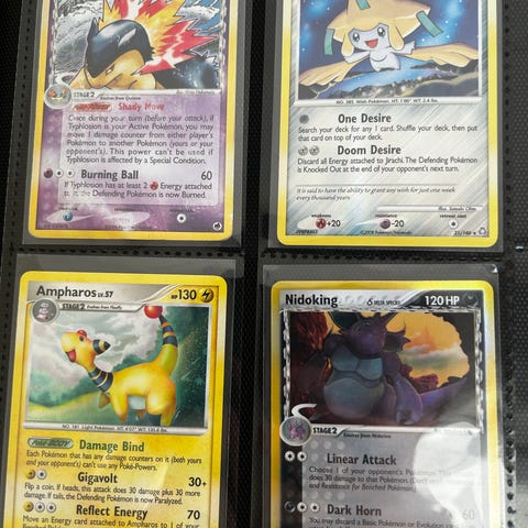 Selger diverse vintage Pokémon-kort. Tilstand er vel rundt HP/MP – Deoxys er i dårligst stand.