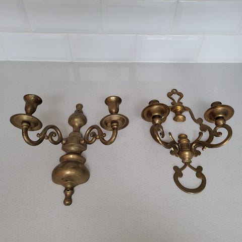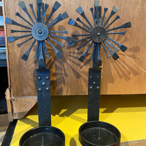 Par med vintage kulelysestaker , diverse bulker og patina , passer kronelys som sitter dypt i lysestakene , antagelig svensk