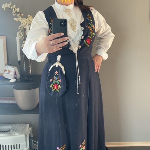 Brukt bunad selges høystbydende over 25 . 1000. Stor sølje, bringe sølje , forkle , underskjørt, øredobber og mansjett knapper følger med . Bringeduk er slitt kan fås med sammen med belte. Perlet