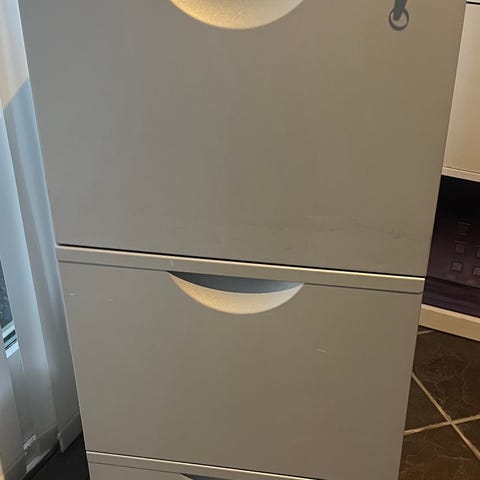 Skuffer til blyanter osv øverst, den nederste skuffen er til hengemapper.