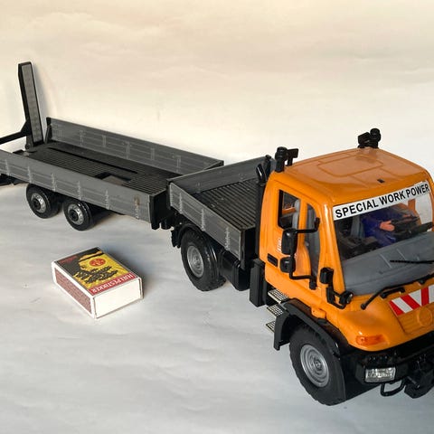 Lastebil med oransje førerhus og grå lasteplan. Ca. 30 cm* 17 cm