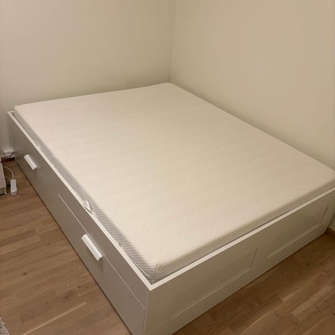 IKEA Malm sengeramme med 4 skuffer selges. Pent brukt og uten skader. I fargen sort som er utgått og ikke mulig å få tak i hos IKEA. Madrass følger med om ønskelig.