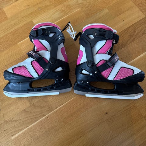 Bauer barn skøyter størrelse 32-35 i fargene hvit og rosa. Skøytene er laget for ishockey og har justerbare spenner for god passform. Materialet inkluderer slitesterk plast og tekstil for komfort og støtte. Må hentes