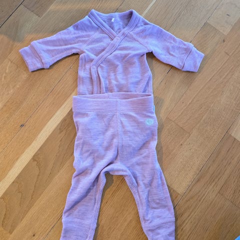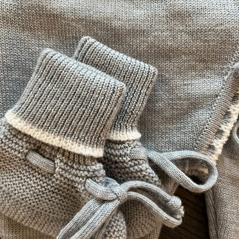 Hentesett for nyfødt med lue og tøfler. Litt gul merke på dressen, dette kan nok fint vaskes bort. Selges derfor billig.