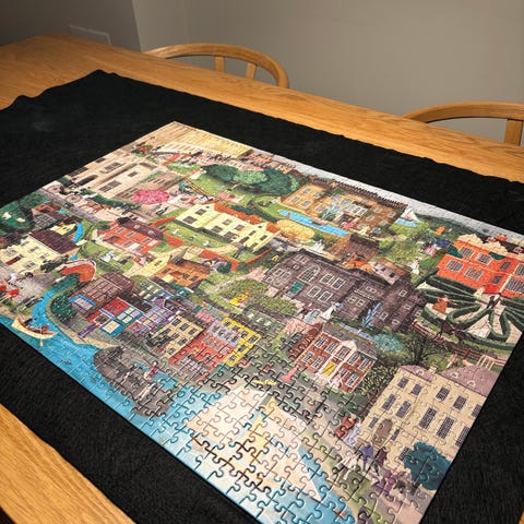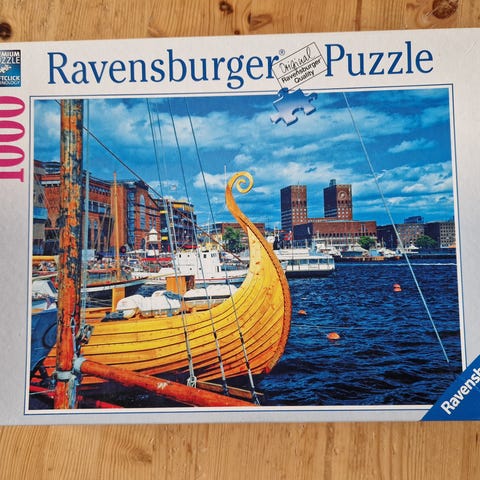 Ravensburger Viking Skip puslespill med 1000 brikker. Motivet viser et vikingskip i Oslo med rådhuset i bakgrunnen.