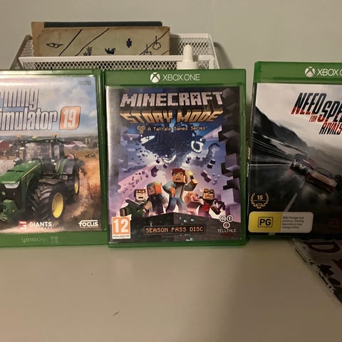 Xbox One spillpakke med fem spill: Farming Simulator 17, Farming Simulator 19, Battlefield, Need for Speed, og MotoGP 19. Spillene er kompatible med Xbox One.