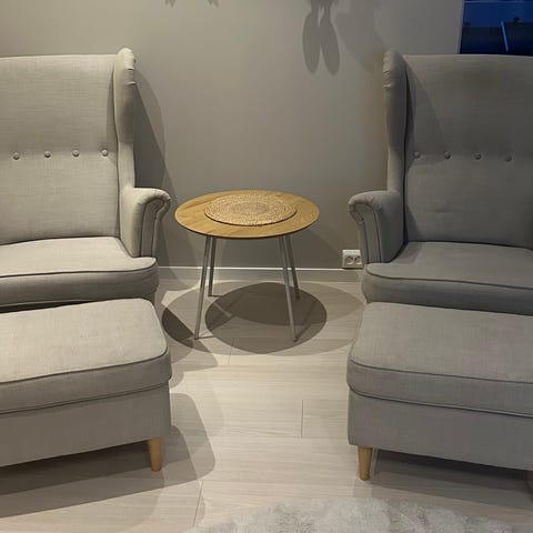 Selger 2 stk gule STRANDMON lenestoler fra IKEA samt tilhørende puff. Stolene er gode å sitte i. Synlig brukt stand med noen bruksspor, men fortsatt fullt funksjonelle. Perfekt for ekstra sitteplasser eller et fargerikt innslag i stua.