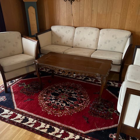 Restaurert Stilsalong, der alder er ukjent, opptrekt og med nytt fyll i seteputene. Litt falmet på sofaryggen pga. sollys.