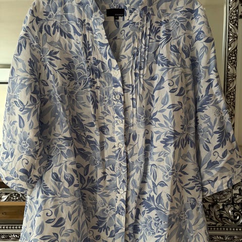 Ubrukt, grå-grønn topp m/ blonde FREQUENT, selges