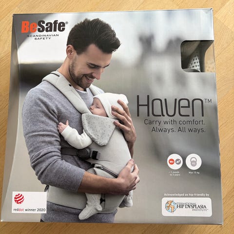 BeSafe Haven bæresjal for baby i svart farge. Passer for barn fra 4 uker til 3 år med maksimal vekt på 15 kg. Designet for å gi komfort og støtte under bæring.
