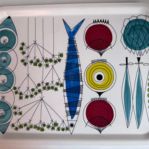 Selger et unikt og stilrent serveringsfat. Fatet har en organisk, nyre-formet fasong som er typisk for 50- og 60-talls design. Den røde delen har et flott grafisk mønster med svarte linjer.
