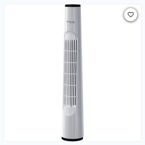 Point vifte i hvit farge med tilhørende fjernkontroll. Viften har en høy og slank design, egnet for å gi luftstrøm i rom. Fjernkontrollen har knapper for enkel justering av viftemodus og hastighet.