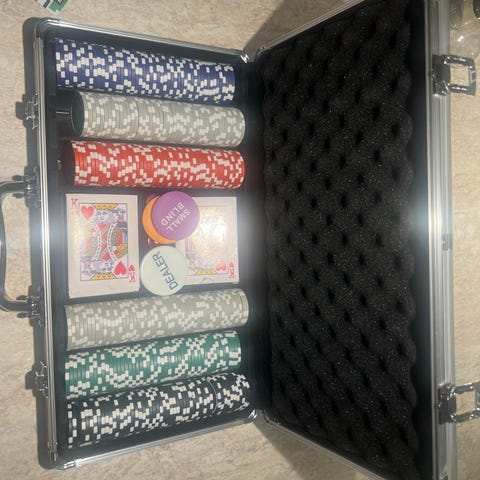 Settet inneholder fire stabletårn med sjetonger (rød, hvit, blå, grønn, svart), to kortstokker (1 uåpnet kortstokk) og fem terninger i en foret aluminiums koffert. Selges da det ikke blir brukt.