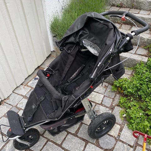 Thule barnevogn sittevogn i limegrønn og grå farge. Utstyrt med sikkerhetssele og beskyttende tak med nett for ventilasjon. Passer til bruk for barn med komfort og sikkerhet. Bakre håndtak er defekt, noe som gjør det vanskelig å gå. Det festes godt til sykkelen og håndteres godt på veien.
