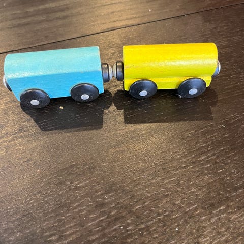 BRIO Treleketøy Togsett i tre med fargene rød, grønn, gul og blå. Togsettet består av to sammenkoblede vogner med hjul, laget i tremateriale. Klossene settes sammen av magneter.