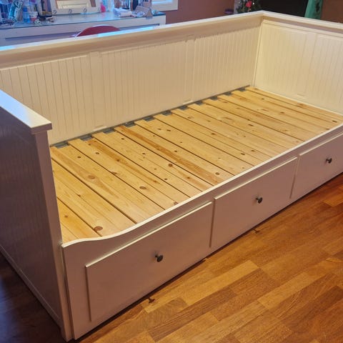 Selger en Brimnes seng fra IKEA. Noen av bildene er lånt fra IKEA da det var litt vanskelig å få tatt gode bilder der den står. Selges da den ikke blir brukt. Har blitt brukt som gjesteseng så er nesten ikke brukt. Følger med 2 stk madrasser malfors også fra IKEA. Kjøpt ny i 2020