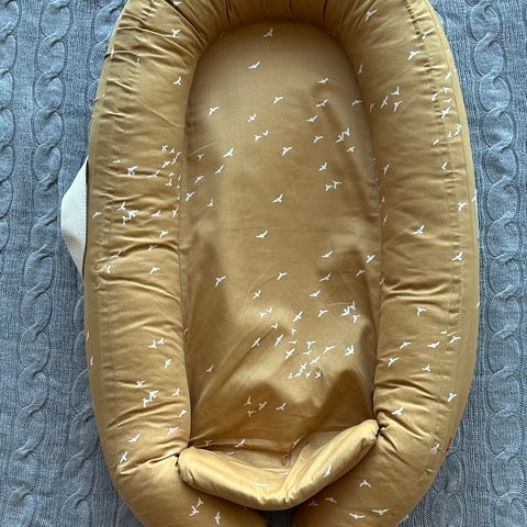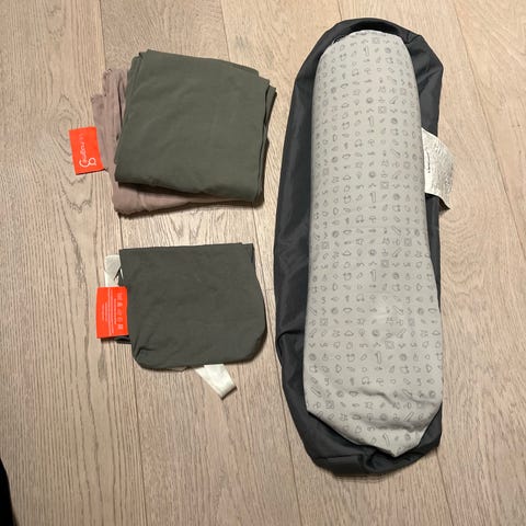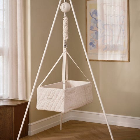 Classic Hengevugge Bundle fra Moonboon leies ut. Tilnærmet ubrukt og ny i 2025. Settet inkluderer hengevugge med madrass i økologisk bomull i fargen seagrass, gulvstativ i farge warm grey og appstyrt motor Connect Basic.