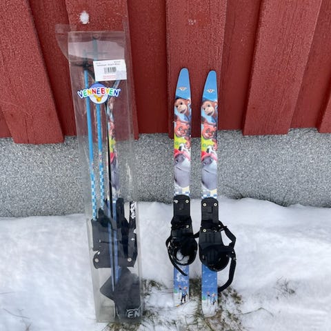 Vennebyen ski med staver på 55cm. Kan brukes med vanlige sko. Perfekt som første ski. Litt av maling er gått av på den ene tuppen men har ingenting å si for funksjonen. Kommer med praktisk oppbevaring/reisepose.