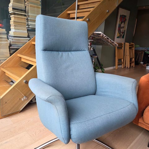 Superfin lenestol i grått skinn fra Hjort Knudsen. Med svingfunksjon. Jeg har selv kjøpt stolen brukt for ei stund siden, men selger den videre pga. kjøp av ny stol.