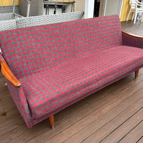 Veldig fin, brukt sovesofa i teak. Blå og grønn-mønstret. Kan leveres i Oslo eller Drammen mot kjøretillegg. Gi bud.