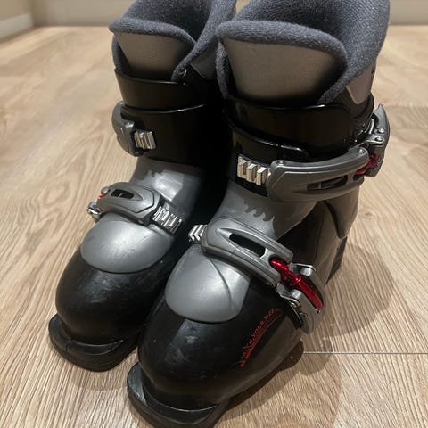 Pent brukte skistøvler til barn.