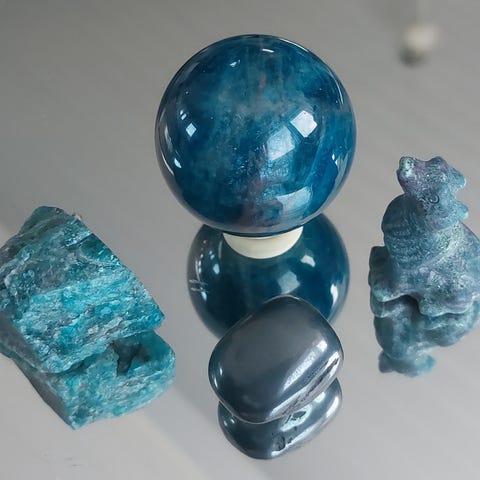 Blå apatitt er en krystall kjent for å fremme kommunikasjon, mental klarhet, inspirasjon og personlig vekst, ved å åpne halschakraet for ærlig uttrykk og stimulere tredje øye for åndelig innsikt og synske evner. Den bidrar også med en beroligende effekt, reduserer stress, balanserer følelser, og kan hjelpe med å løse opp forvirring og negativitet, samt styrke fokus og kreativitet.