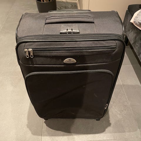 Stor samsonite koffert i hardplast. Kofferten har to hjul og uttrekkbart håndtak. Nett og sikkerhetsstropper inni. Har kodelås med tre tall.