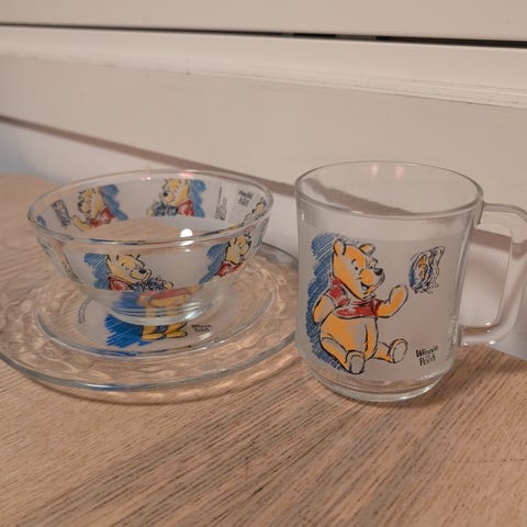 To Ole Brumm glass og to kopper den lille er i plast fra Cole & Mason.