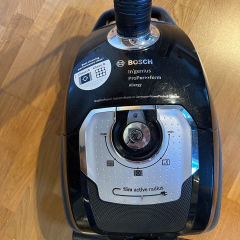 Bosch Ergonomaxx'x støvsuger med tilhørende slange og munnstykke. Hjul er knekt, kan brukes men er veldig irriterende. Fin delestøvsuger.
