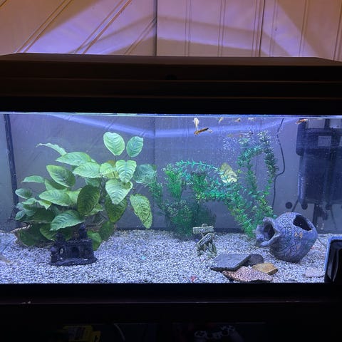Har to papegøye fisker to scalarer ei malle husker ikke navn å noe chiklider Noe stein og røtter følger og endel utstyr