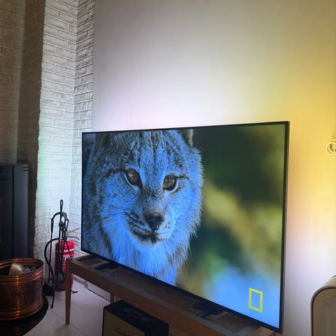Jeg har montert et kamera-basert lyssystem som gjør at lyset på veggen følger fargene på skjermen tilsvarer Philips Ambilight. Dette gir en fantastisk dybde og stemning i stua.