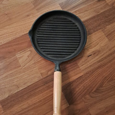 Stekepanne i jern, fantastisk flott og velfungerende panne. Pannen er gjort ren og brent inn med fett, så klar til bruk. Se bilde for størrelse. Kan brukes på induksjon, gass, vanlig platetopp eller bare på bål i skogen. Fantastisk og steke kjøtt i blant annet.