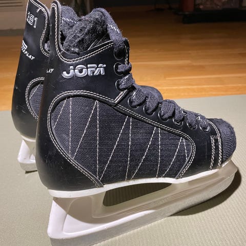 Jofa ishockeyskøyter for barn i størrelse 36. Skøytene er designet for bruk i ishockey og har tradisjonell snøring. Materialet og farge er svart med hvite detaljer.