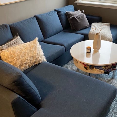 Sofa med lenestol og puff blå tekstil