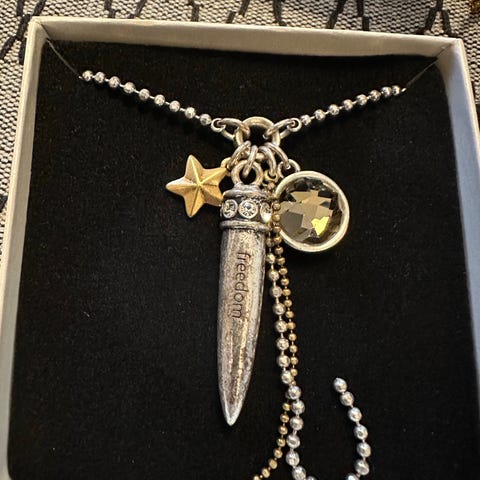 Kraftfullt og tøft statementsmykke fra A&C, i sølvfarget bijouteri, med flere detaljer og anheng som gir et rått, urbant preg. Smykket består av flere lenker, stjerneanheng, dekorative steiner og et karakteristisk anheng formet som en liten patron, med inngravert tekst: