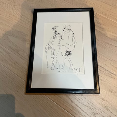 Signert original tusjtegning av Kåre Bondesen, kjent avistegner fra Aftenposten og A-magasinet. Utvendig mål ramme 33 x 28 cm.