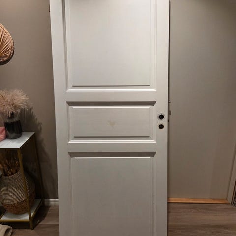 Hvitmalte innerdører med klassisk design, inkludert dørhåndtak og låsemekanisme. Døren har tre paneler og er egnet for innendørs bruk.