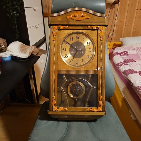 Klassisk veggklokke fra midten av 1900-tallet med mekanisk urverk og pendel.