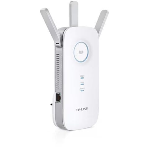 TP-Link AC1200 Wi-Fi Extender Router med dual band-funksjon. Enheten har to eksterne antenner, en Ethernet-port og støtter trådløs nettverkstilkobling for å forbedre Wi-Fi-dekning i hjem eller kontor.
