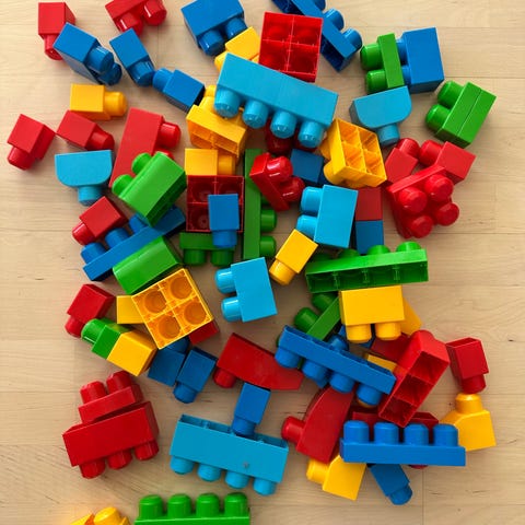 Byggeklosser for barn. Inneholder ulike fargerike byggeklosser i forskjellige størrelser, egnet for små barn. Materiale er plast, designet for enkel håndtering og lek.