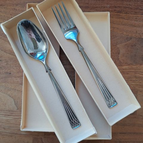 Selger 6 skjeer, 6 kniver u/riller og 6 gafler av merke Arve,