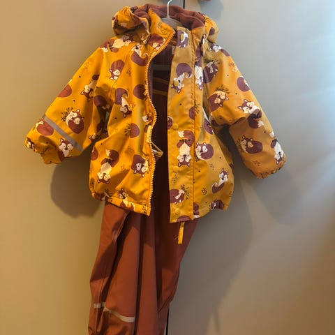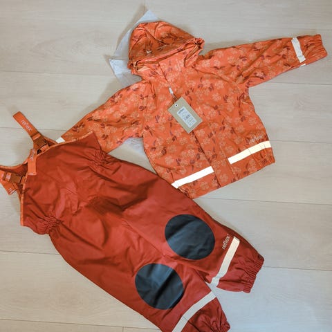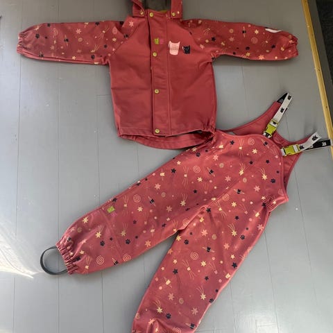 Todelt Kattnakken Plask regnsett str 80. Brukt en høst i barnehagen som supplement til regndress. Derfor ingen synlig slitasje, samt inntakte fotstrikker.