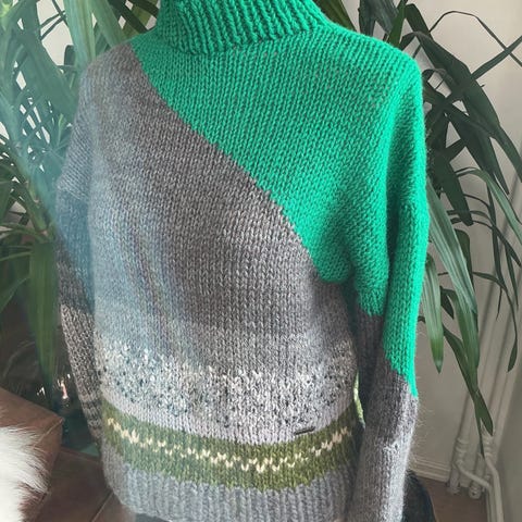 Lekker cardigan heklet i bomull/merino. Satt sammen av bestemorsruter i nydelige blåfarger.