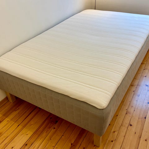Flott dobbelt seng, bestående av IKEA Skårer rammemadrasser og sengegavl. Farge lysgrå. Sengen står på treben. Den har stått på gjesterom, med overmadrass, og er nesten ikke brukt.