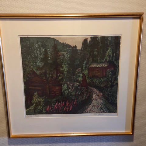 Stående modell. Tresnitt, 31x19 cm. Usignert. Nyinnrammet 47,5x35