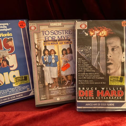 Samling av VHS-filmer med titlene Norske Byggeklosser Indiana Jones og det siste korstog, James Bond Goldfinger og Gremlins 2.