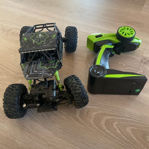 M2E RC bil fjernstyrt offroad bil i hvit farge. Inkluderer fjernkontroll, batteri og lader. Designet for terrengkjøring med store dekk og robust chassis.
