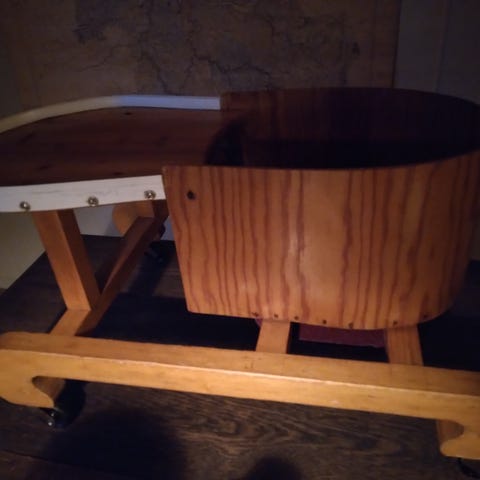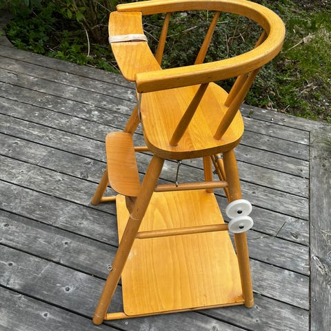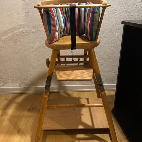 Barnestol med mulighet for å vende om til lekebord og stol. Seler og sydd pute med rygg medfølger.