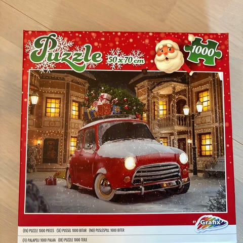 Grafix Julepuzzle 1000 brikker med julemotiv som viser julenisse i slede med reinsdyr foran et hus pyntet til jul.